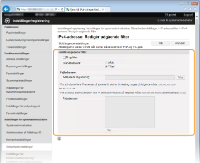 ![]() Kontrollér, om der er indtastningsfejl Hvis IP-adresserne er indtastet forkert, kan du muligvis ikke få adgang til maskinen fra Brugerinterface til fjernbetjening. I dette tilfælde skal du angive <IPv4-adressefilter> eller <IPv6-adressefilter> til <Fra>. IPv4-adressefilter IPv6-adressefilter