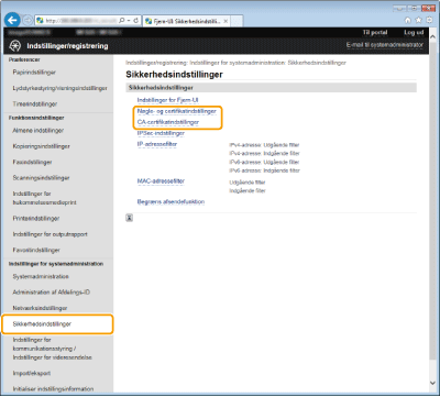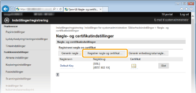 [Nøgle- og certifikatindstillinger] (for nøglepar) eller [CA-certifikatindstillinger] (for CA-certifikater).