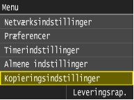 Alle indstillinger for kopien vises med korte beskrivelser. Standardindstillingerne er angivet med en daggert (