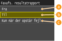 Vælg denne indstilling, hvis du kun vil udskrive en rapport over transmissionsresultater for fax/rapport over transmissionsresultater for e-mail/fil, når der sker en afsendelsesfejl.