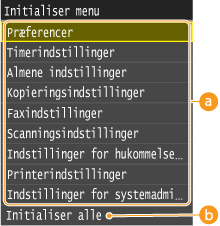 <Menu>  <Indst. for systemadministration>  <Initialiser menu>   Vælg det element, du vil initialisere  <Ja>  Genstart maskinen, hvis det er nødvendigt.