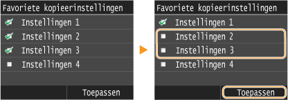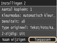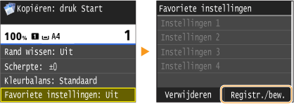 Als u een veelgebruikte instelling zelf verwijdert, die is geregistreerd voor weergave op het scherm Start voor <Kopiëren>, <Fax> of <Scannen>, wordt de startschermknop waaraan deze instelling is toegewezen, ook verwijderd.