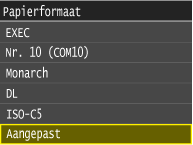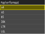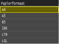 Het bovenstaande scherm wordt niet weergegeven als papier wordt geladenAls u altijd hetzelfde papier gebruikt in de papiertafel, kunt u het opgeven van de papierinstellingen overslaan door het formaat en type papier vast te leggen als de standaardinstelling. In dat geval wordt het bovenstaande scherm niet meer weergegeven. Als u het scherm wel wilt weergeven, selecteert u <Uit> voor <Registreer standaardinst.> (Standaardpapierinstellingen registreren voor de papiertafel).
