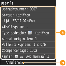 Hier ziet u het aantal kopieën, de gekozen instellingen en andere details. Als u alleen de details wilt controleren zonder het kopiëren te annuleren, drukt u op