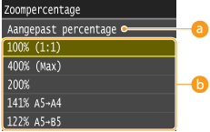 U kunt kopieën vergroten of verkleinen door een vooraf ingesteld zoompercentage te gebruiken zoals <A5->A4> of door in stappen van 1% een aangepast zoompercentage in te stellen.