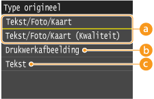 U kunt de optische beeldkwaliteit voor de kopie selecteren op basis van het documenttype, zoals documenten met alleen tekst, documenten met grafieken en tabellen of documenten met tijdschriftfoto's.