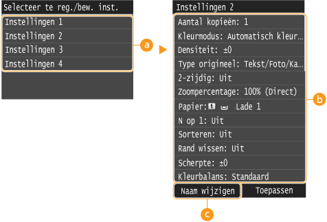 U kunt maximaal vier veelgebruikte combinaties van kopieerinstellingen opslaan. Door eenvoudig een opgeslagen combinatie van instellingen te selecteren als u dit nodig hebt, hoeft u dezelfde instellingen niet opnieuw te configureren telkens als u kopieën maakt. Als u bijvoorbeeld vaak het aantal kopieën instelt op 5, stelt u <Rand wissen> in op <Aan> en vergroot u de scherpte tijdens het kopiëren. U kunt combinaties van instellingen opslaan onder elke gewenste naam.