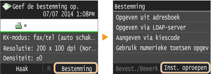 U kunt een bestemming selecteren uit de drie laatst gebruikte bestemmingen. Als u een eerder gebruikte bestemming opgeeft, worden ook de laatst gebruikte faxinstellingen, zoals de dichtheid, voor die bestemming geselecteerd.