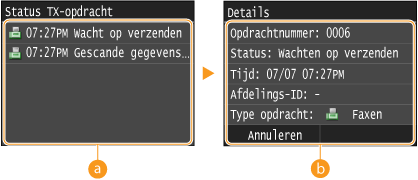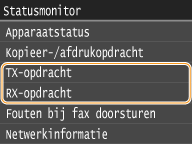 ![]() <Status TX-opdracht>/<Status RX-opdracht>Hier ziet u een lijst met de documenten die worden verzonden of ontvangen, of die wachten op verwerking.