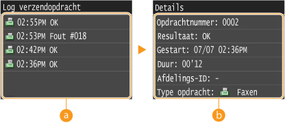 ![]() <Log verzendopdracht>/<RX-opdrachtlog>Hier ziet u een lijst met de documenten die zijn verzonden en ontvangen. <OK> geeft aan dat een document zonder problemen is verzonden of ontvangen, en <Fout> betekent dat een document niet is verzonden of ontvangen omdat de bewerking is geannuleerd of omdat er een fout is opgetreden.