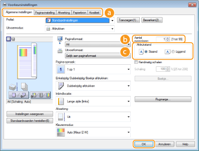 Klik op een tabblad om de bijbehorende afdrukinstellingen weer te geven en pas de instellingen waar nodig aan.