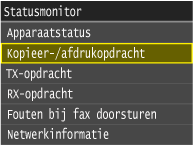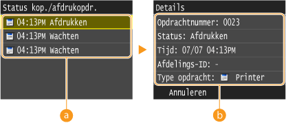 ![]() <Status kop./afdrukopdr.>Hier ziet u een lijst met de documenten die worden verwerkt, die worden afgedrukt of die wachten op verwerking.