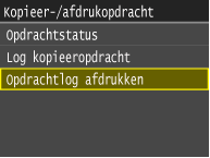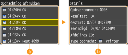 ![]() <Opdrachtlog afdrukken>Hier ziet u een lijst met de documenten die zijn afgedrukt. <OK> geeft aan dat een document zonder problemen is afgedrukt, en <Fout> betekent dat een document niet is afgedrukt omdat de bewerking is geannuleerd of omdat er een fout is opgetreden.