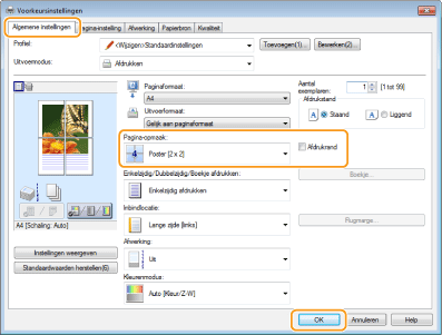 selecteer bij [Pagina-opmaak] de afmetingen van de poster (bijvoorbeeld [Poster [2 x 2]])