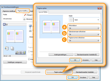 Als u datums, aanmeldingsnamen of paginanummers gaat afdrukken, kunt u opmaakinstellingen wijzigen zoals het lettertype en de tekengrootte. Klik op het scherm Pagina-opties hierboven op [Indelingsinstellingen] om de opmaakinstellingen op te geven.