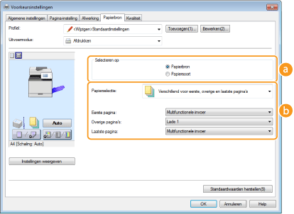 ![]() [Selecteren op]Selecteer [Papierbron] zoals in het voorbeeld dat hierboven wordt beschreven wanneer u specifiek papier wilt gebruiken voor bepaalde pagina's.