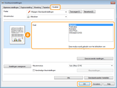 Als u gedetailleerde instellingen wilt opgeven voor de items die u hebt geselecteerd bij [Doel], klikt u op [Geavanceerde instellingen]. Klik voor meer informatie op [Help] in het printerstuurprogramma.