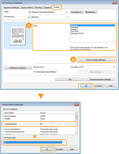 U kunt in het printerstuurprogramma instellen dat documenten met minder toner worden afgedrukt.