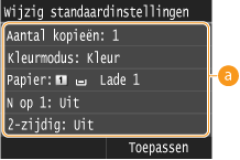 De standaardinstellingen zijn de instellingen die worden weergegeven wanneer u het apparaat inschakelt of op