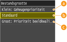 De gescande documenten worden geconverteerd naar de opgegeven bestandsindelingen. Op dat moment kunt u het compressieniveau van het bestand opgeven. Als u <Klein: Geheugenprioriteit> selecteert, wordt een hogere compressieverhouding gebruikt dan normaal en is het resultaat een kleiner bestand met een lagere beeldkwaliteit. Als u echter <Groot: Prioriteit beeldkwaliteit> selecteert, wordt een lagere compressieverhouding gebruikt dan normaal en is het resultaat een groter bestand met een hogere beeldkwaliteit.
