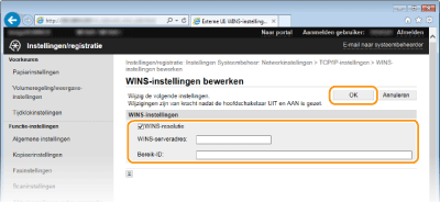 Als het IP-adres van de WINS-server wordt verkregen van een DHCP-server, heeft het verkregen IP-adres prioriteit boven het IP-adres dat is ingevoerd in het vak [WINS-serveradres].