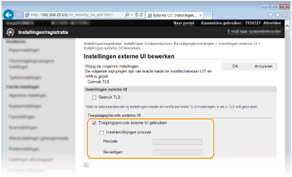 <Instellingen Systeembeheer> <Instellingen externe UI> <Beveiligingsinstellingen voor toegang via externe UI> <Aan> Voer pincode in Toepassen Voer pincode in (bevestiging) Toepassen.Als de instellingen voor de UI op afstand worden geïnitialiseerdDe pincode voor toegang tot de UI op afstand wordt ook geïnitialiseerd. Na een initialisatie stelt u de pincode opnieuw in. Menu initialiseren