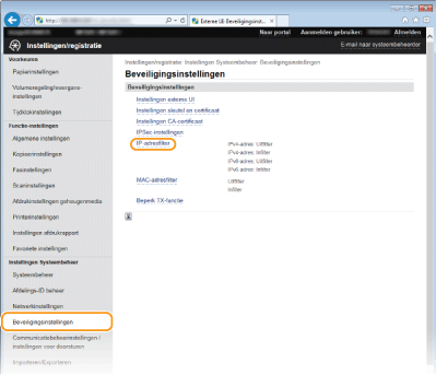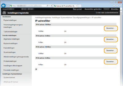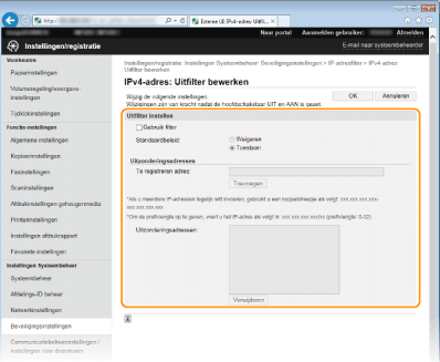 Als u IP-adressen verkeerd invoert, kunt u het apparaat mogelijk niet bereiken vanuit de UI op afstand. Om dat op te lossen, moet u <IPv4-adresfilter> of <IPv6-adresfilter> instellen op <Uit>. IPv4-adresfilter IPv6-adresfilter