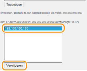 Een IP-adres verwijderen uit de uitzonderingen Selecteer een IP-adres en klik op [Verwijderen].