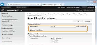 Typ in het vak [Beleidsnaam] maximaal 24 alfanumerieke tekens als naam voor de set met beleidsinstellingen.