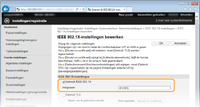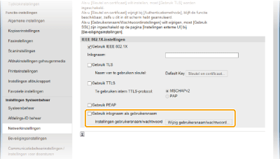 Schakel het selectievakje [Gebruik IEEE 802.1X] in, typ de aanmeldingsnaam in het vak [Loginnaam] en geef de vereiste instellingen op.