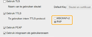 Bij deze verificatiemethode wordt de clientverificatie uitgevoerd met een gebruikersnaam en wachtwoord, en de serververificatie met een CA-certificaat. U kunt MSCHAPv2 of PAP selecteren als het interne protocol. TTLS kan gelijktijdig worden gebruikt met PEAP. Configureer deze verificatiemethode pas nadat u TLS hebt ingeschakeld voor de UI op afstand (