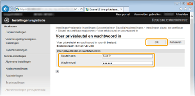 Voer de naam van het sleutelpaar en het wachtwoord in en klik op [OK].