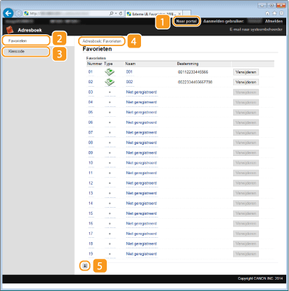 Hiermee geeft u de codes voor verkort kiezen en de favorietenlijst weer die in het adresboek zijn geregistreerd. U kunt het adresboek ook opslaan of wijzigen als u zich hebt aangemeld in de systeembeheerdersmodus. Adresboek wijzigen via de UI op afstand