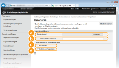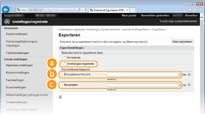 U kunt de instellingen van menuopties opslaan op uw computer of de geregistreerde gegevens opslaan op het apparaat. De geëxporteerde gegevens kunnen worden geïmporteerd. Als u hetzelfde model gebruikt, kunnen andere apparaten de gegevens importeren die van dit apparaat zijn geëxporteerd en omgekeerd. Deze bewerkingen kunt u alleen uitvoeren als u zich hebt aangemeld in de systeembeheerdersmodus.