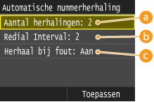 Geef aan hoe vaak de machine het nummer opnieuw moet kiezen. Tik op
