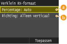 Hiermee kunt u instellingen opgeven voor het verkleinen van een ontvangen document. U kunt een verkleiningspercentage selecteren dat automatisch wordt toegepast om het ontvangen document te verkleinen tot het formaat van het geladen papier. U kunt ook een percentage selecteren in een lijst.