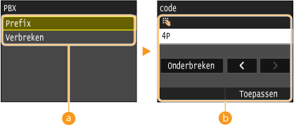 Als het apparaat via een telefooncentrale met het netwerk is verbonden, moet de toegangsmethode worden ingesteld. U kunt het type telefooncentrale instellen op <Prefix> of <Verbreken>. Als u het nummer voor het kiezen van een buitenlijn toewijst aan de R-toets, kunt u eenvoudig een buitenlijn kiezen.