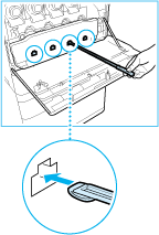 Duw de stofwerende glasreiniger, met de stofpad aan het uiteinde omlaag gericht, zover mogelijk in de uitsparingen die in de afbeelding worden aangegeven, en beweeg de reiniger voorzichtig heen en weer.