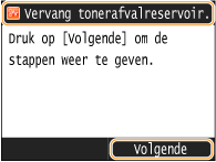 Welk bericht precies wordt weergegeven, is afhankelijk van de resterende ruimte in het tonerafvalreservoir. Zorg dat u een nieuw tonerafvalreservoir bij de hand hebt of tref voorbereidingen om het huidige reservoir te vervangen, al naar gelang de instructies in het bericht.