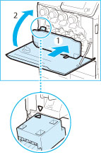Plaats de markering op het tonerafvalreservoir precies onder de markering op de sleuf van het apparaat, en duw het tonerafvalreservoir naar binnen.