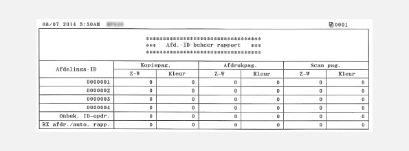 Als Afdelings-ID beheer is ingeschakeld, kunt u per <Afdelings-ID> het totale aantal afdrukken controleren door een Afdelings-ID beheerrapport af te drukken. Als u weet wat voor aantallen er worden afgedrukt, kunt u de voorraad papier en toner beter beheren.