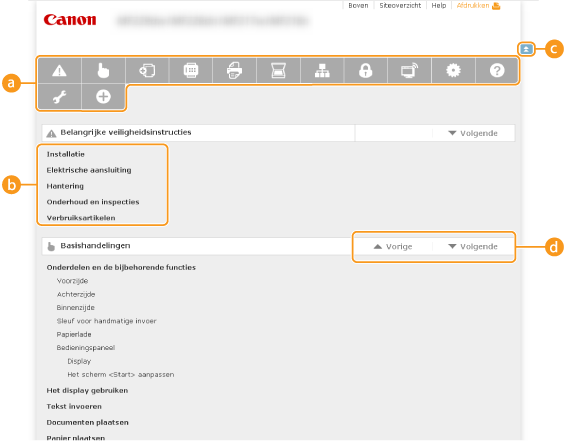 De e-Handleiding is opgesplitst in verschillende schermen en de inhoud van elk scherm varieert.