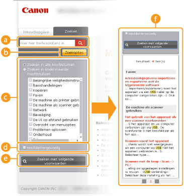 Geeft de zoekresultaten weer van de pagina's die de opgegeven trefwoorden bevatten. Zoek in de resultaten naar de gewenste pagina en klik op de onderwerptitel van de pagina. Als de resultaten niet op één pagina passen, klikt u op