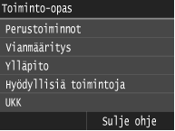 Paina palataksesi edelliseen ikkunaan. Jos painat tätä painiketta, kun määrität esimerkiksi asetuksia, asetuksia ei oteta käyttöön ja näyttö palaa edelliseen näyttöön.