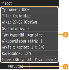 Kopioiden määrä, asetukset ja muut tiedot näytetään. Jos haluat vain tarkistaa tiedot peruuttamatta kopiointia, palaa kopioinnin päänäyttöön painamalla