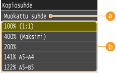 Voit suurentaa tai pienentää kopioita käyttämällä ennalta asetettu kopiointisuhdetta, kuten <A5->A4>, tai määrittämällä mukautetun kopiointisuhteen 1 %:n tarkkuudella.