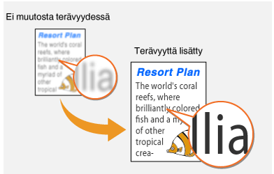 Voit tuotaa epäterävän tekstin ja viivat terävämpinä ja valokuvat parempina. Lisää terävyyttä, kun haluat tarkentaa sumeaa tekstiä tai viivoja, tai vähennä terävyyttä, kun haluat parantaa lehtikuvien ulkoasua.