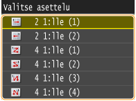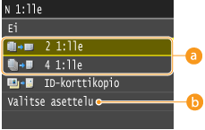Asetus <2 1lle>/<4 1lle> pienentää kopiosuhteen automaattisesti (kopiosuhde näytetään näytössä). Voit suurentaa tai pienentää kopiosuhdetta ennen