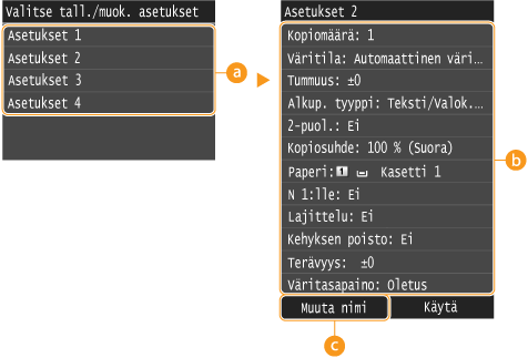 <Suosikkiasetukset> <Poista> napauta tilaa <Kyllä>.Jos haluat käyttää tallennettua asetusta, napauta kohtaa <Kopiointi>