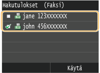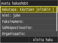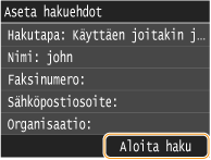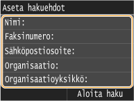 Henkilöiden nimet, faksinumerot, sähköpostiosoitteet, organisaatioiden nimet ja osastojen nimet ovat käytettävissä hakuehtoina vastaanottajia etsittäessä. Voit määrittää useita hakuehtoja samalla kerralla.
